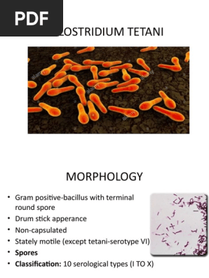 The bacilli are 2mm x 0.5mm in size and usually occur singly although occasionally in chains. Tetani spores are extremely hardy and can be found globally in soil or in the gastrointestinal tract of animals. Clostridium tetani es una bacteria letal 1 formadora de esporas y anaerobia.encontrada en los hogares del ser humano y en la comida, en forma de esporas o como parásito en el tracto gastrointestinal de animales, es causante de infecciones muy graves en los humanos, y provoca la enfermedad del tétanos, generalizado: Clostridium tetani, tetanus (frank geisler) clostridium tetani, tetanus (steffen jähde) klicke hier, um einen neuen artikel im doccheck flexikon anzulegen. Clostridium perfringens (formerly known as c.
